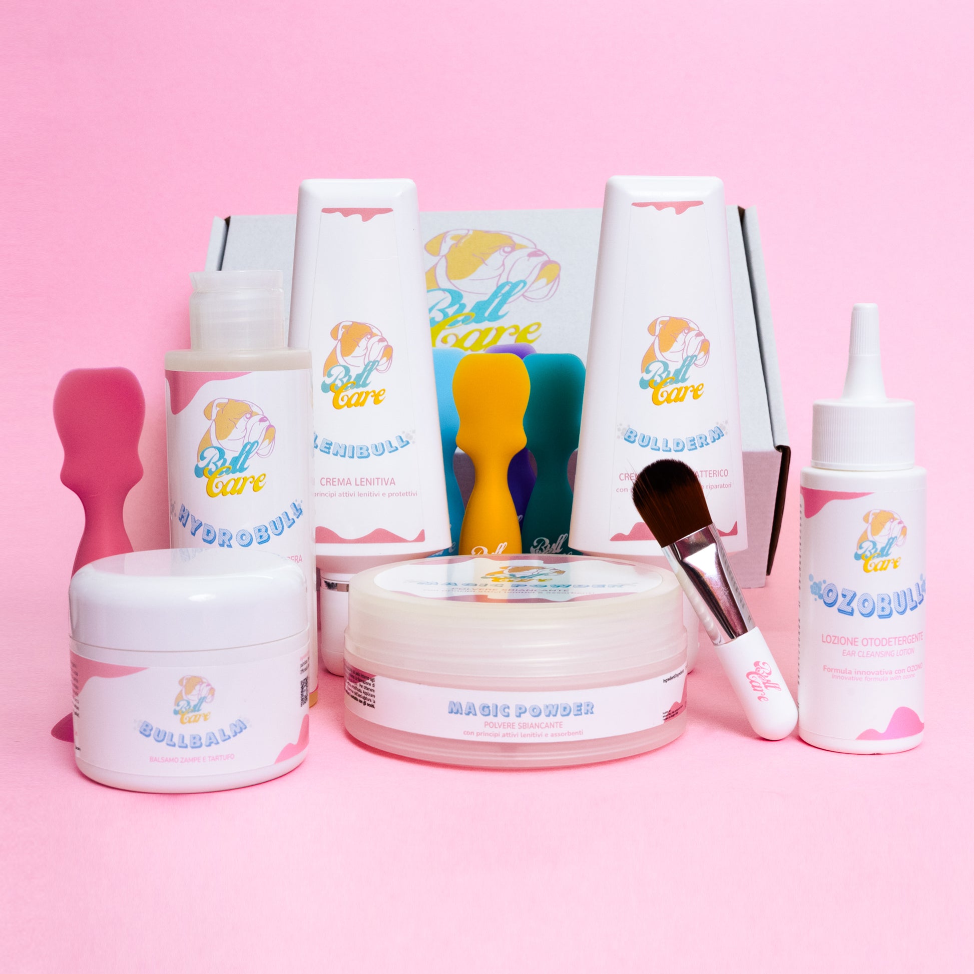 Nos produits sont une routine parfaite : Hydrobull est un shampooing doux, Lenibull prévient la dermatite et les rougeurs, Bullderm combat les bactéries, les rougeurs et les démangeaisons intenses, Bullbalm aide à garder les coussinets doux, Magic Powder blanchit les écoulements, absorbe les kystes interdigitaux, prévient les rougeurs entre les coussinets et garde la zone sous la queue propre, sèche et désinfectée. Pour conclure : Ozobull, la lotion fluide otodérgente à l'ozone.